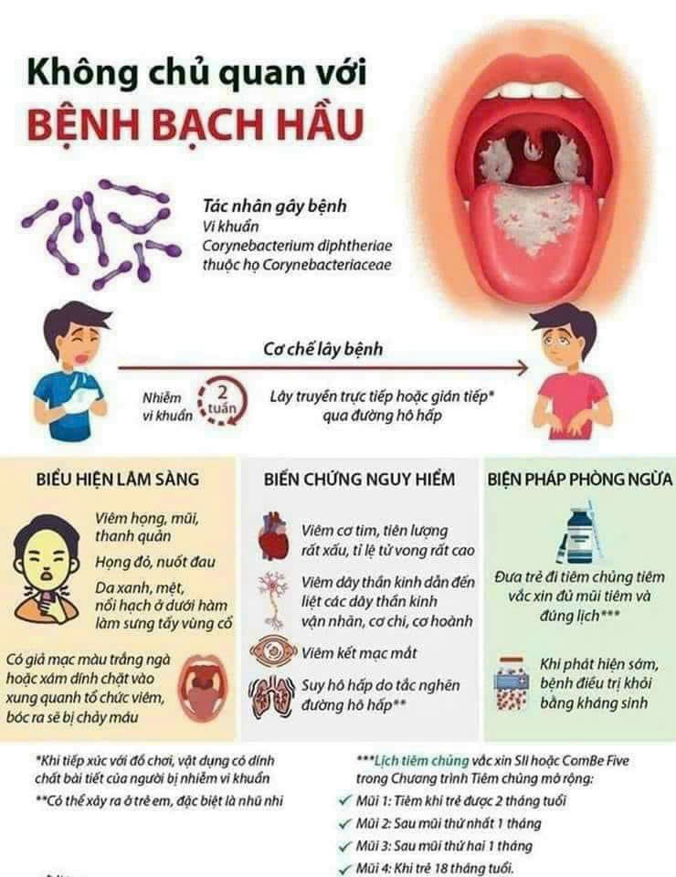 Bệnh bạch hầu là bệnh nhiễm trùng cấp tính làm xuất hiện giả mạc dày dai, trắng ngà, bám chặt và lan nhanh bao phủ toàn bộ vòm họng, mũi, tuyến hạnh nhân, thanh quản. Bệnh còn có thể xuất hiện ở da, các màng niêm mạc khác (kết mạc mắt, bộ phận sinh dục,…).